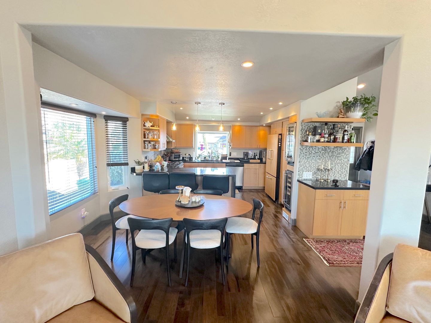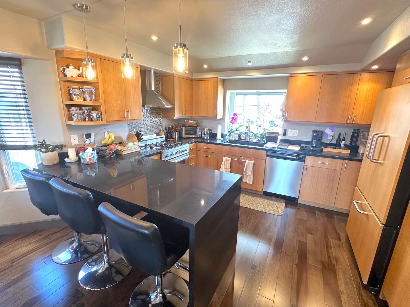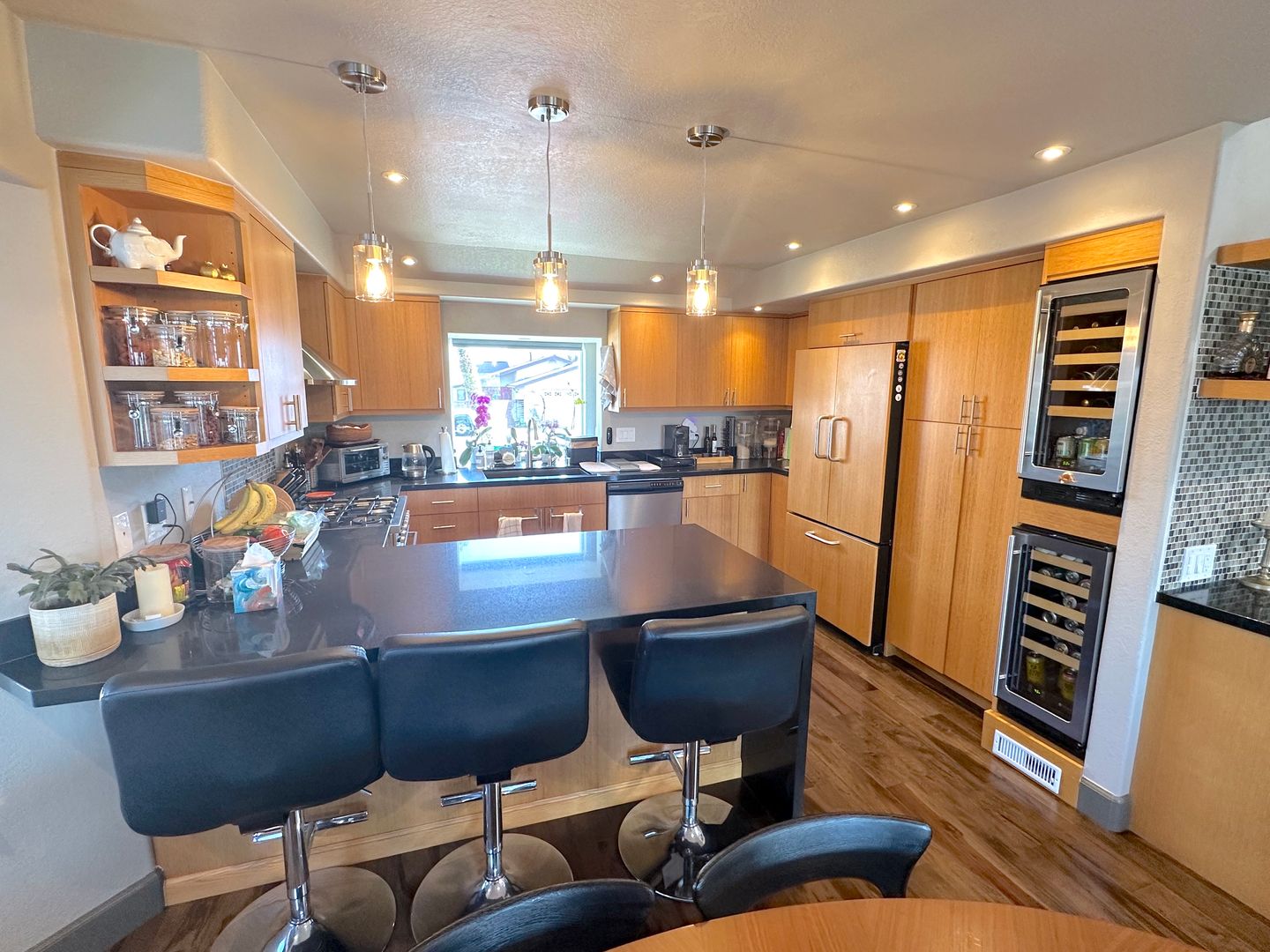 Beautifully remodeled kitchen with sleek black quartz countertops, custom wood cabinetry, high-end stainless steel appliances, a dedicated wine fridge, and modern pendant lighting. The oversized island provides ample prep and seating space, perfect for entertaining.