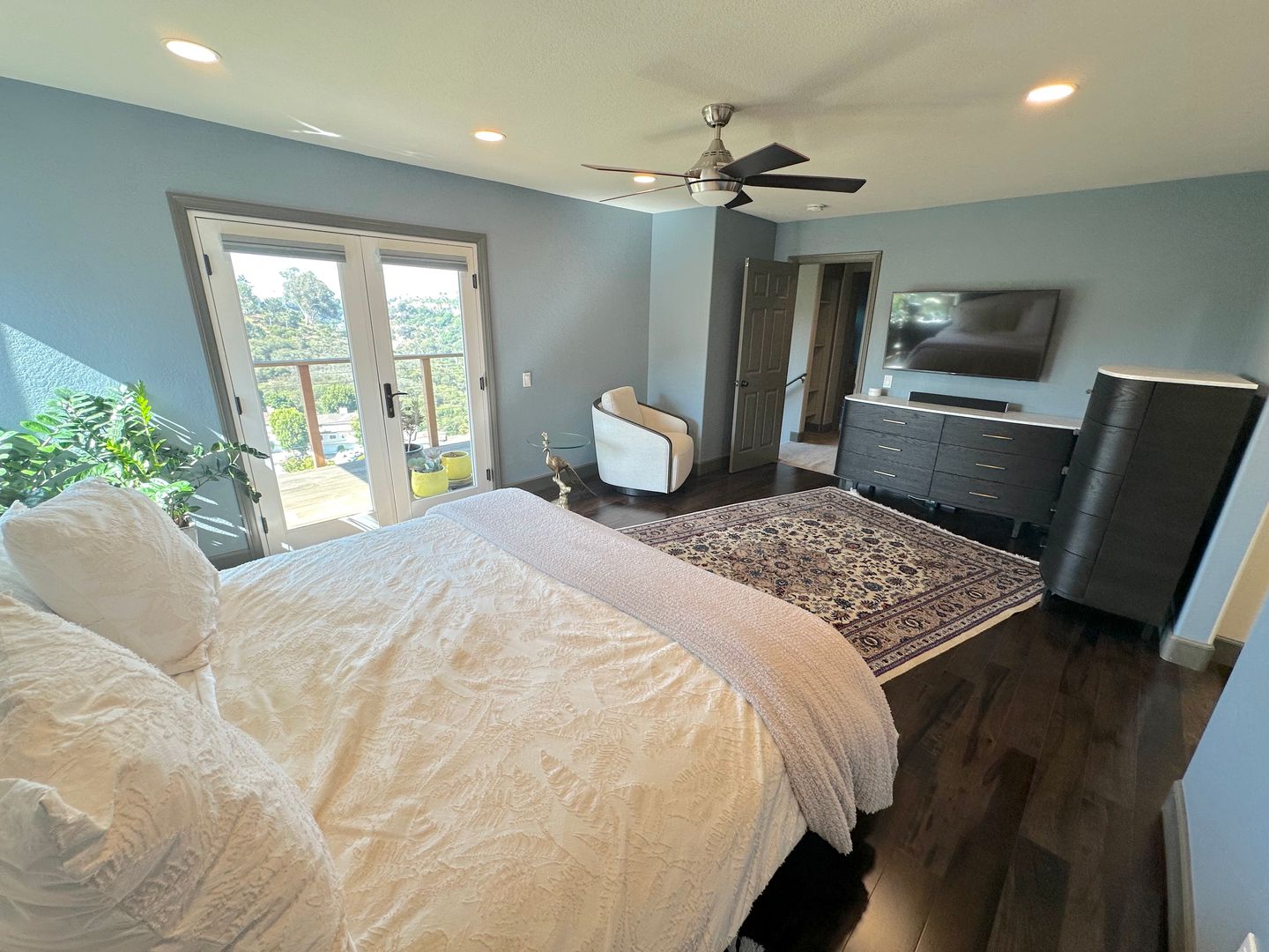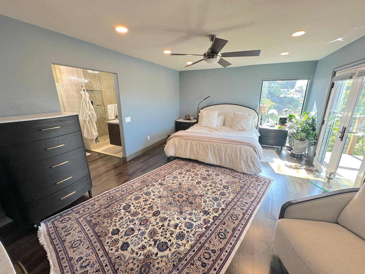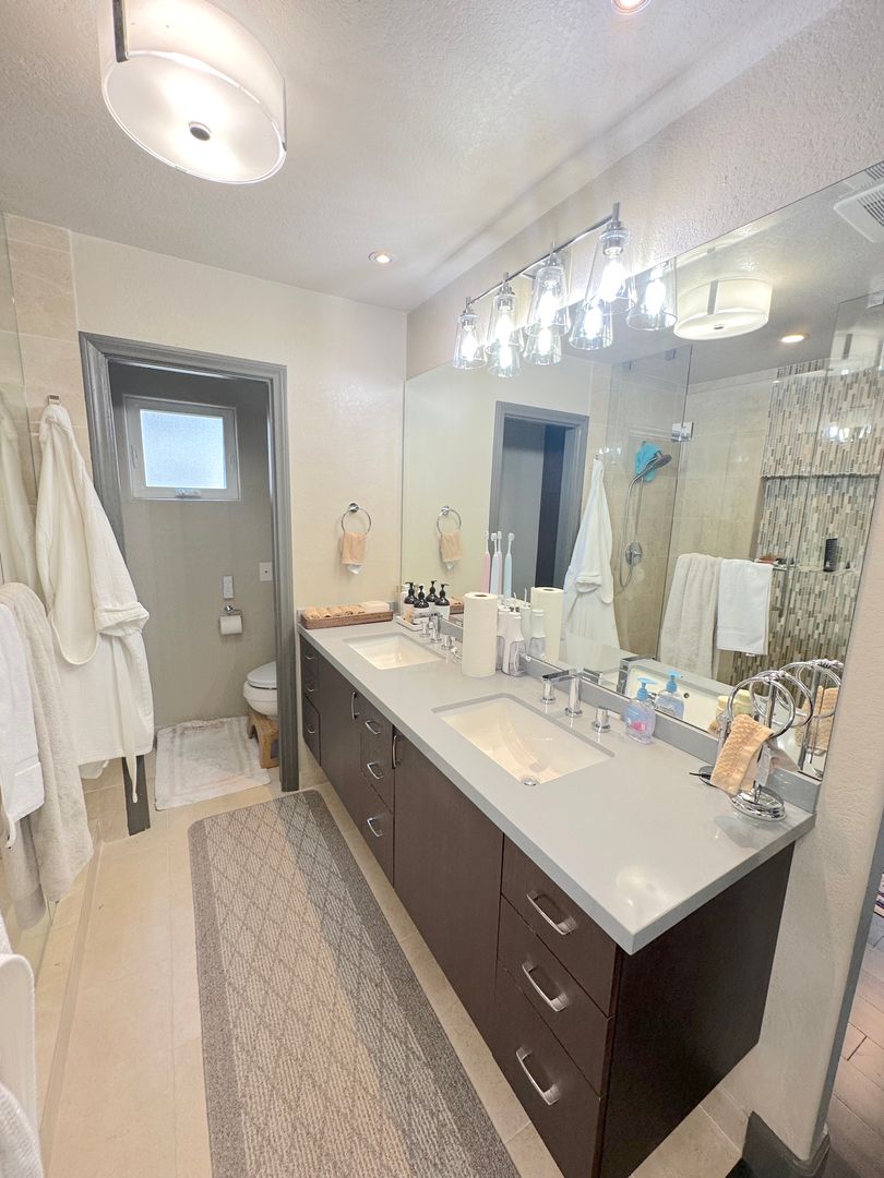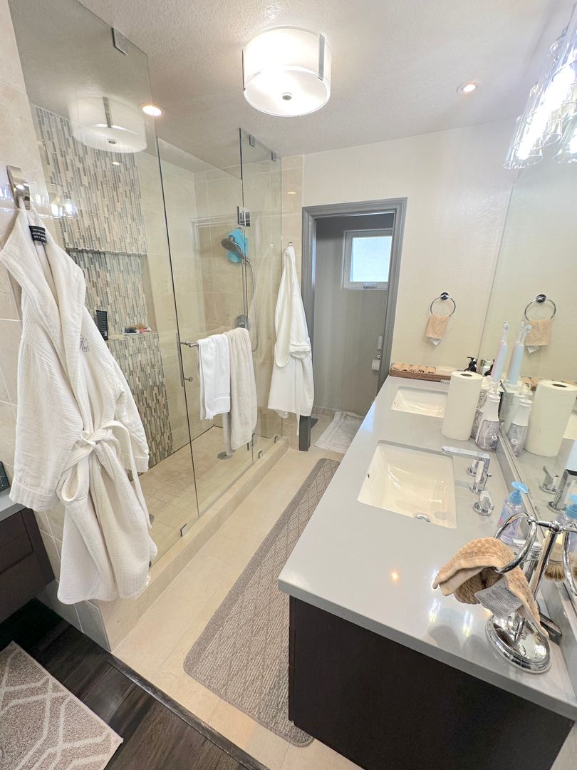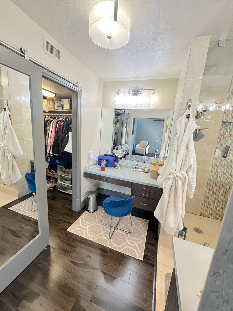 Step into a tranquil master bedroom retreat where large windows and glass doors invite in natural light and frame sweeping hillside views. The master suite includes direct access to a private balcony perfect for morning coffee or sunset relaxation. The spa-inspired master bath features a dual-sink vanity with quartz countertops, a frameless glass walk-in shower with modern tile inlays, and an extended mirror with designer lighting. A separate dressing area includes a stylish built-in vanity and additional mirror, ideal for personal care or daily prep. Walk-in closet access and ample storage complete this elegant and functional master suite.