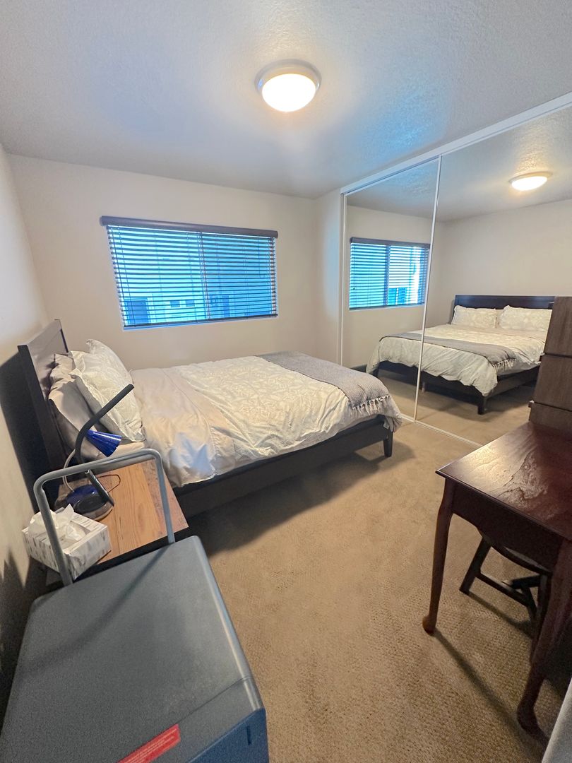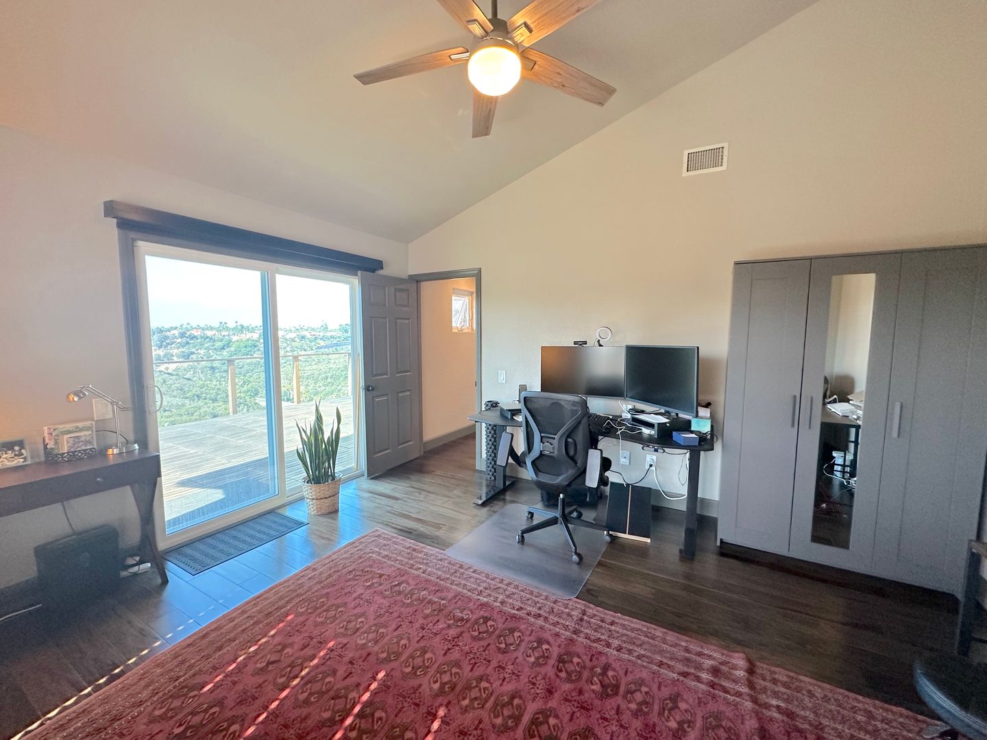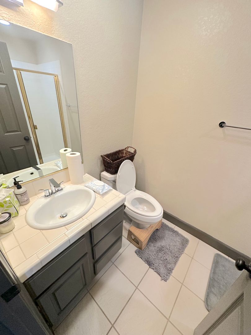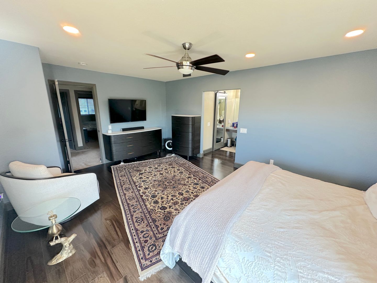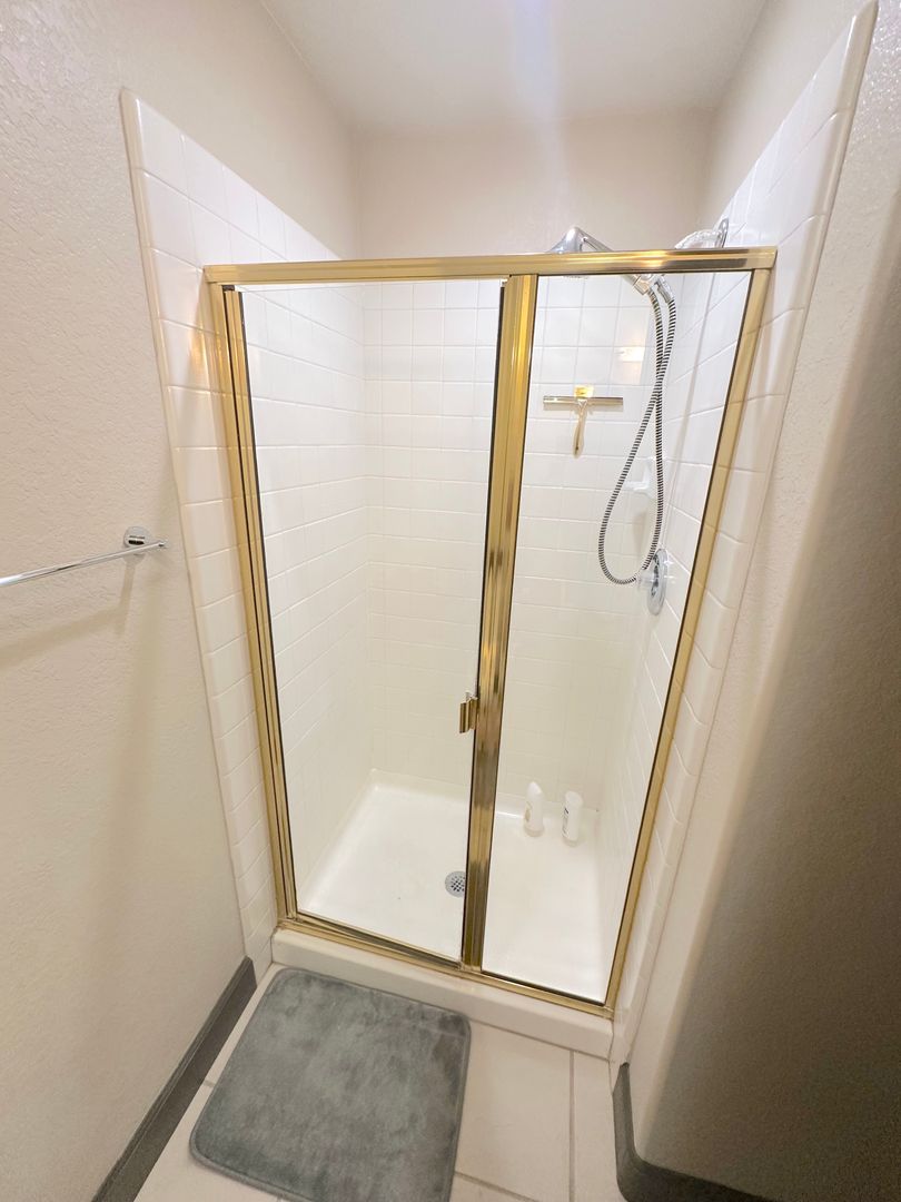 Step into a tranquil master bedroom retreat where large windows and glass doors invite in natural light and frame sweeping hillside views. The master suite includes direct access to a private balcony perfect for morning coffee or sunset relaxation. The spa-inspired master bath features a dual-sink vanity with quartz countertops, a frameless glass walk-in shower with modern tile inlays, and an extended mirror with designer lighting. A separate dressing area includes a stylish built-in vanity and additional mirror, ideal for personal care or daily prep. Walk-in closet access and ample storage complete this elegant and functional master suite.