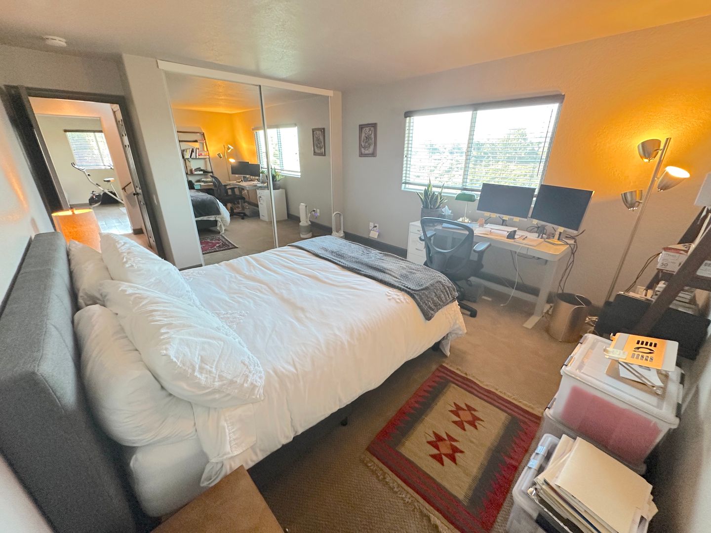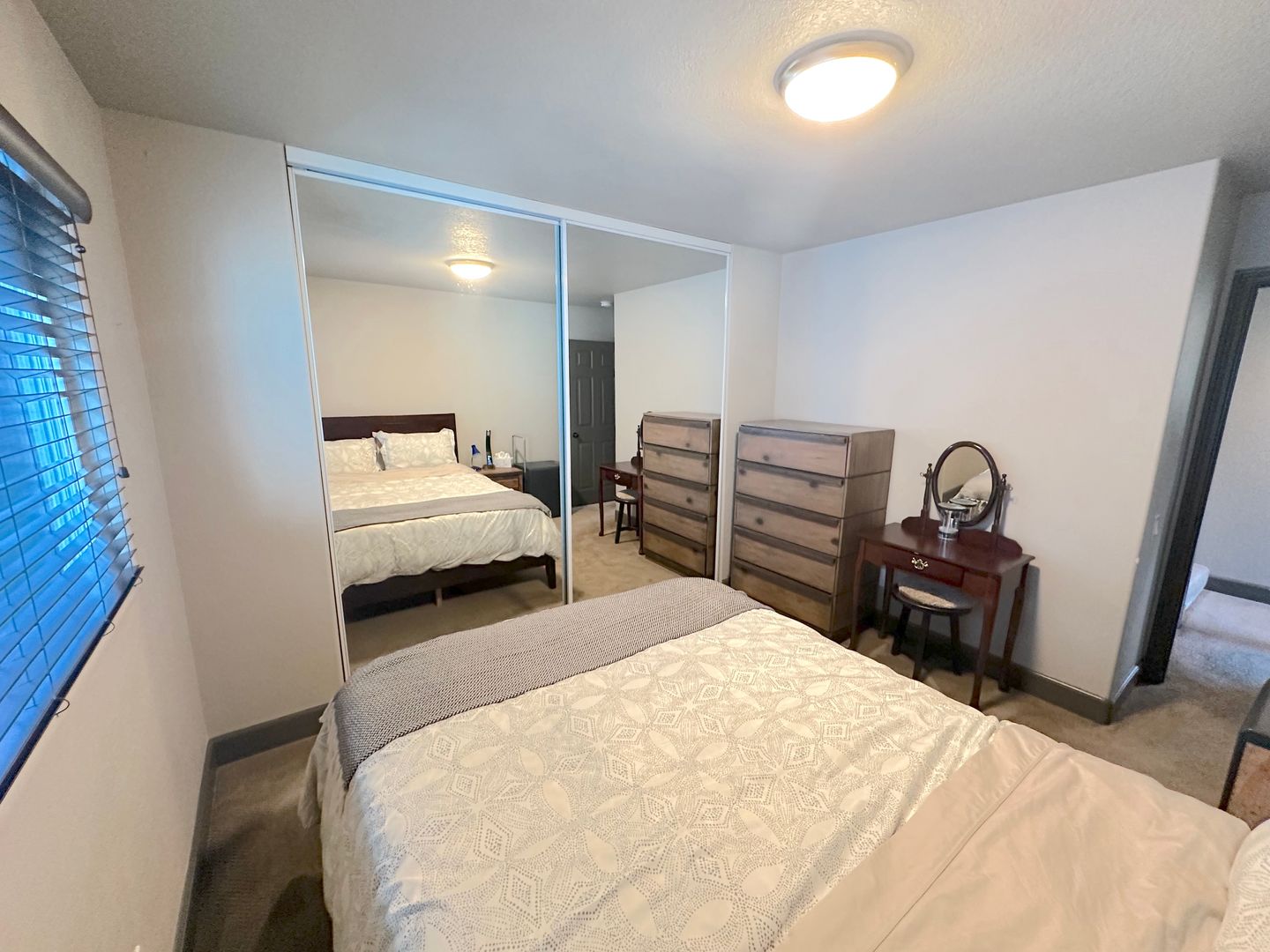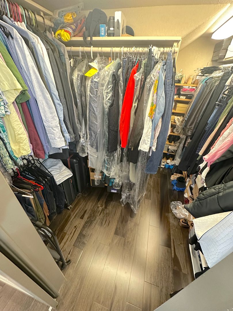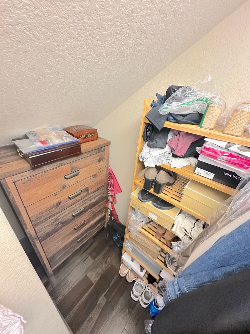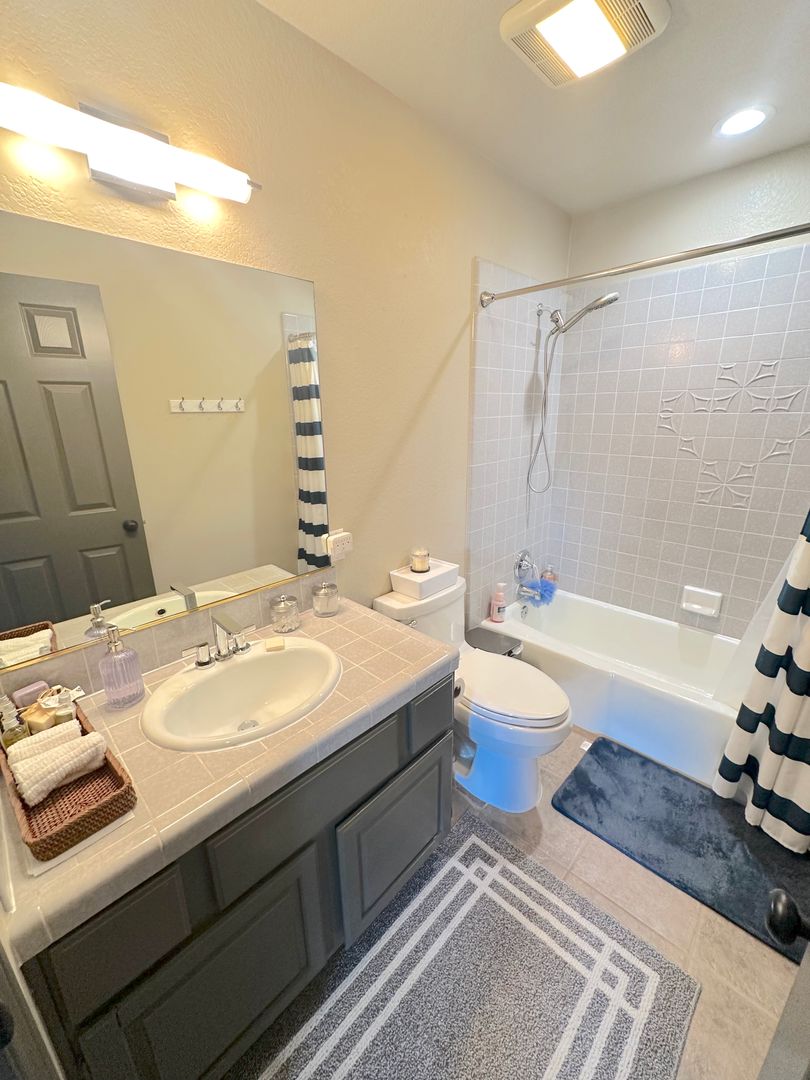 Step into a tranquil master bedroom retreat where large windows and glass doors invite in natural light and frame sweeping hillside views. The master suite includes direct access to a private balcony perfect for morning coffee or sunset relaxation. The spa-inspired master bath features a dual-sink vanity with quartz countertops, a frameless glass walk-in shower with modern tile inlays, and an extended mirror with designer lighting. A separate dressing area includes a stylish built-in vanity and additional mirror, ideal for personal care or daily prep. Walk-in closet access and ample storage complete this elegant and functional master suite.