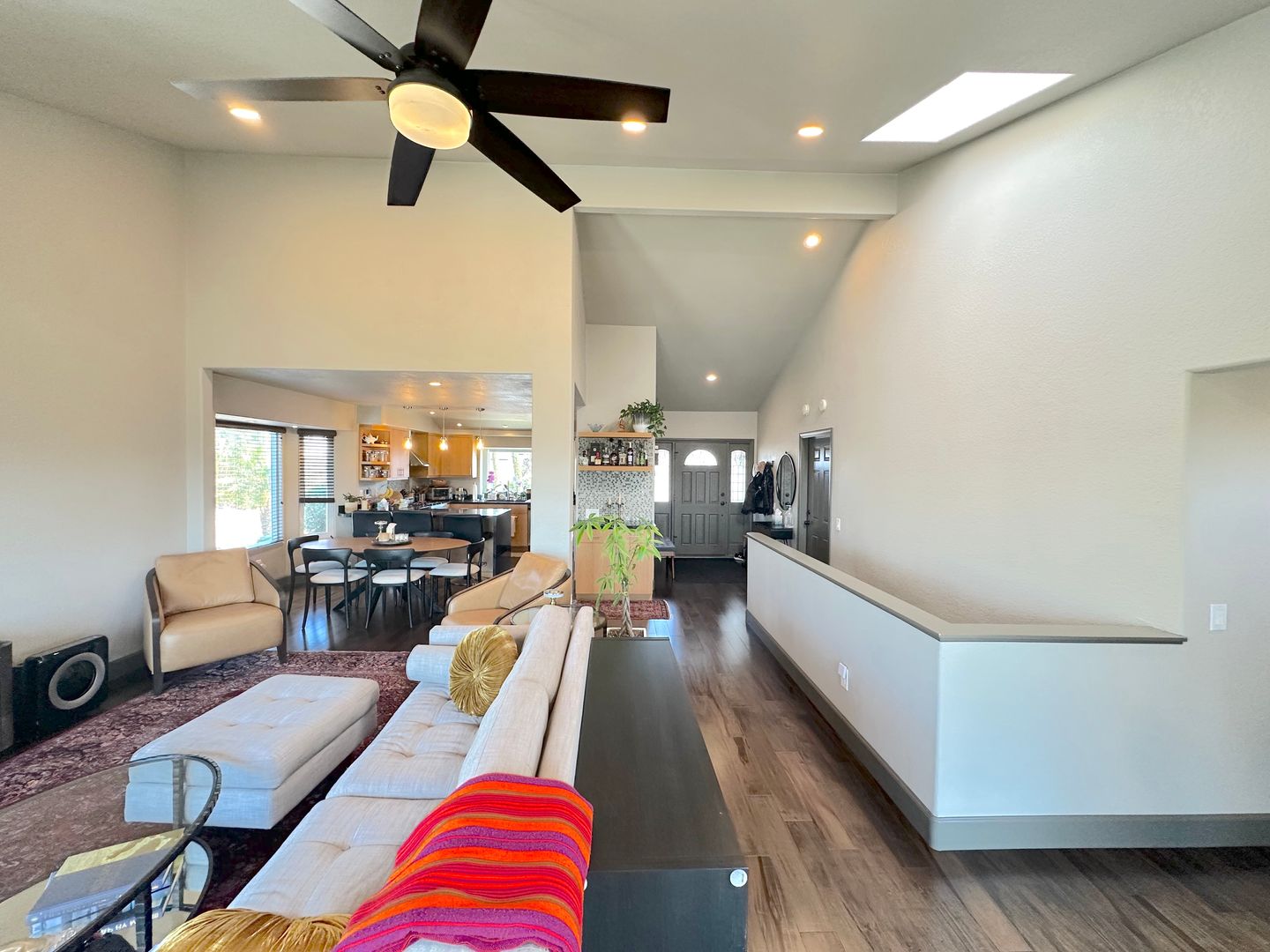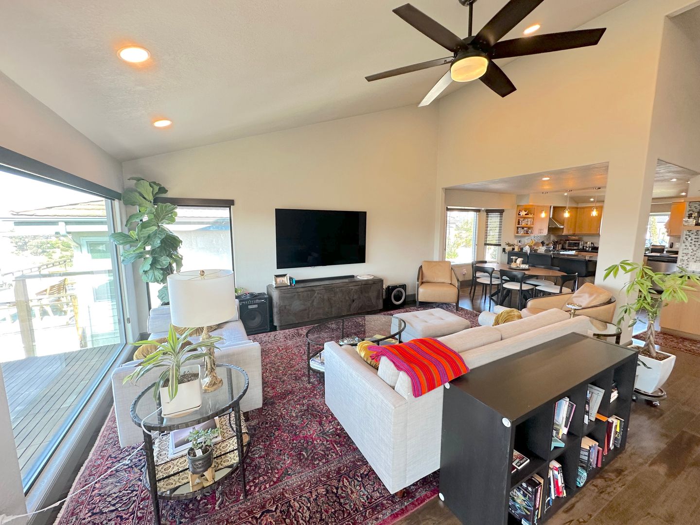 The bright and airy living room flows seamlessly into the dining area and kitchen. Vaulted ceilings, recessed lighting, and large picture windows flood the space with natural light while offering incredible views. Wide-plank wood flooring and stylish tile, modern ceiling fans, and custom shelving elevate every room.