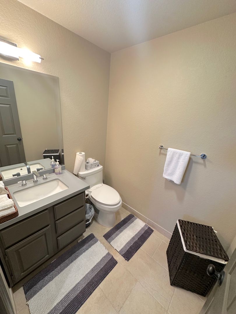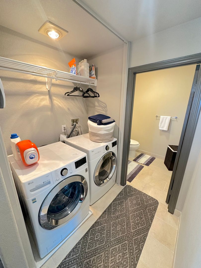 A well-organized laundry nook with updated washer/dryer, adjacent to a sleek, tile-finished half bath. In addition to the ample garage storage, the home features numerous storage options.