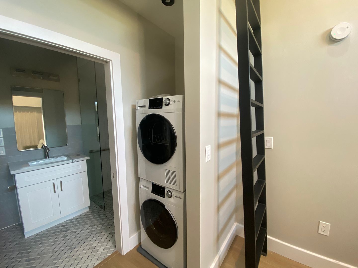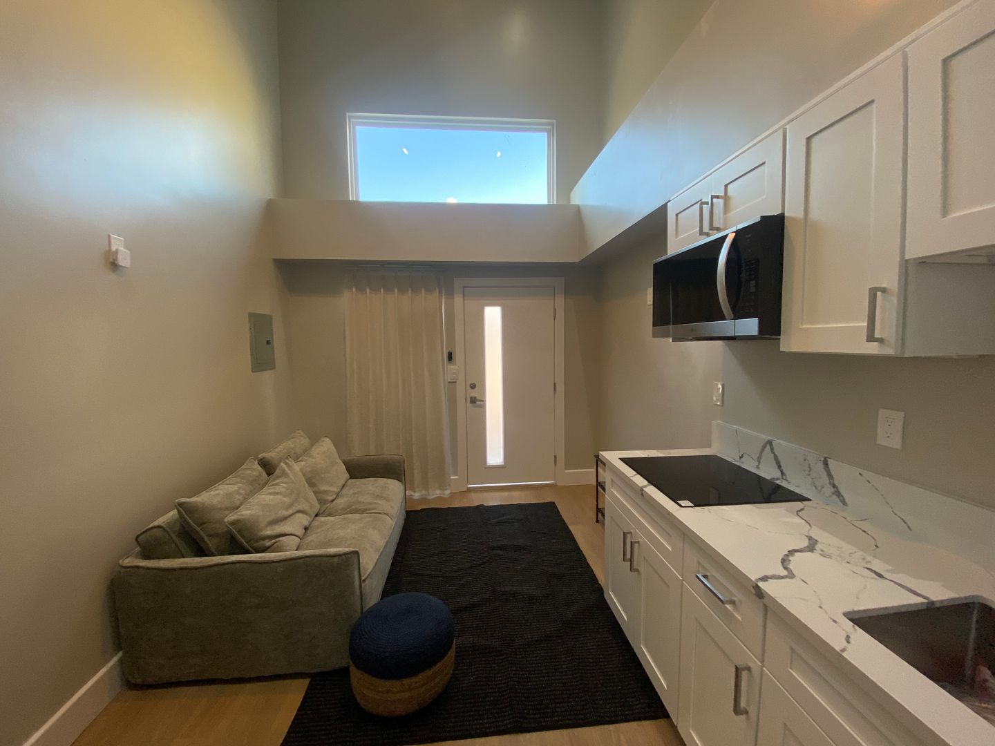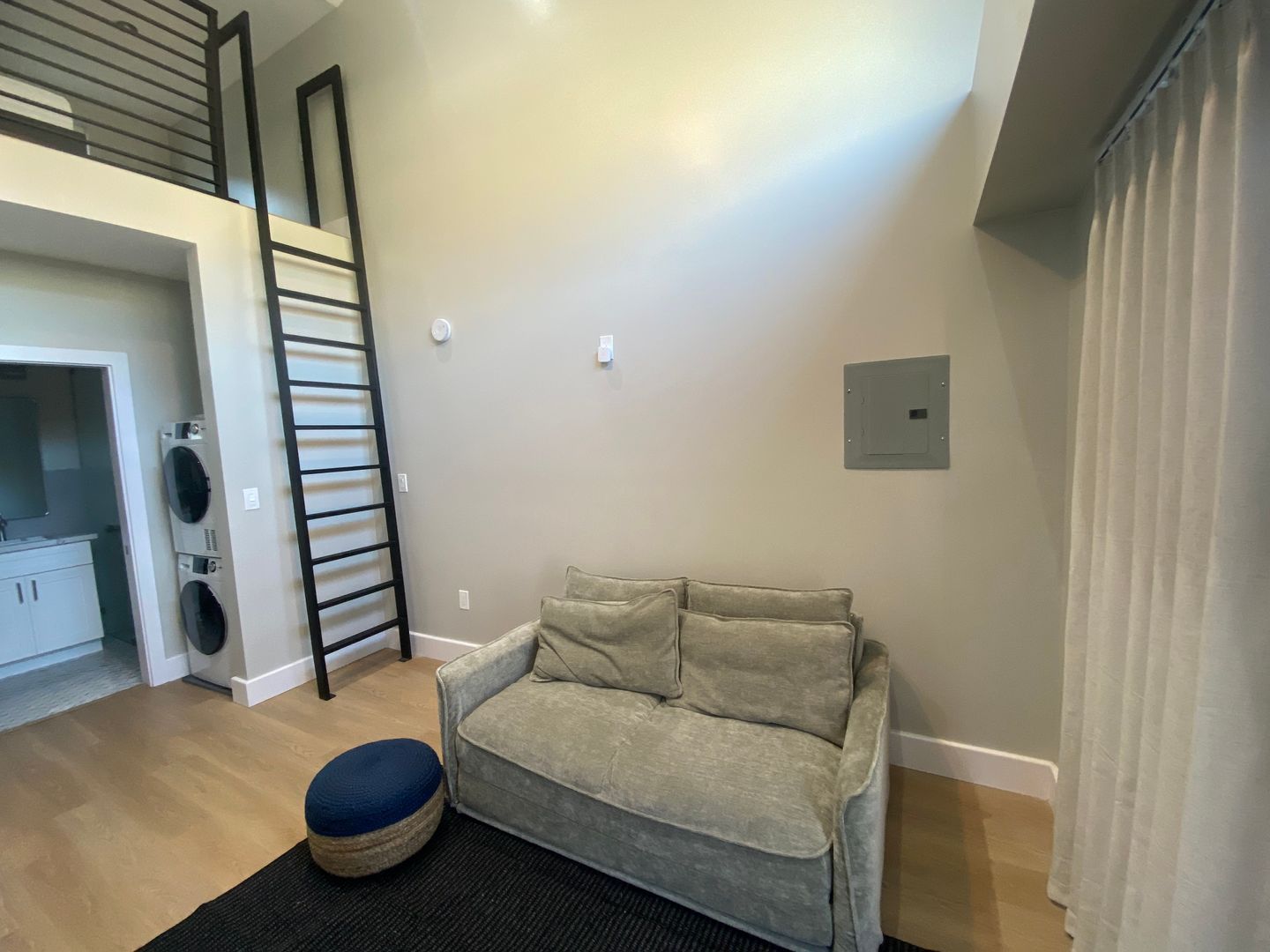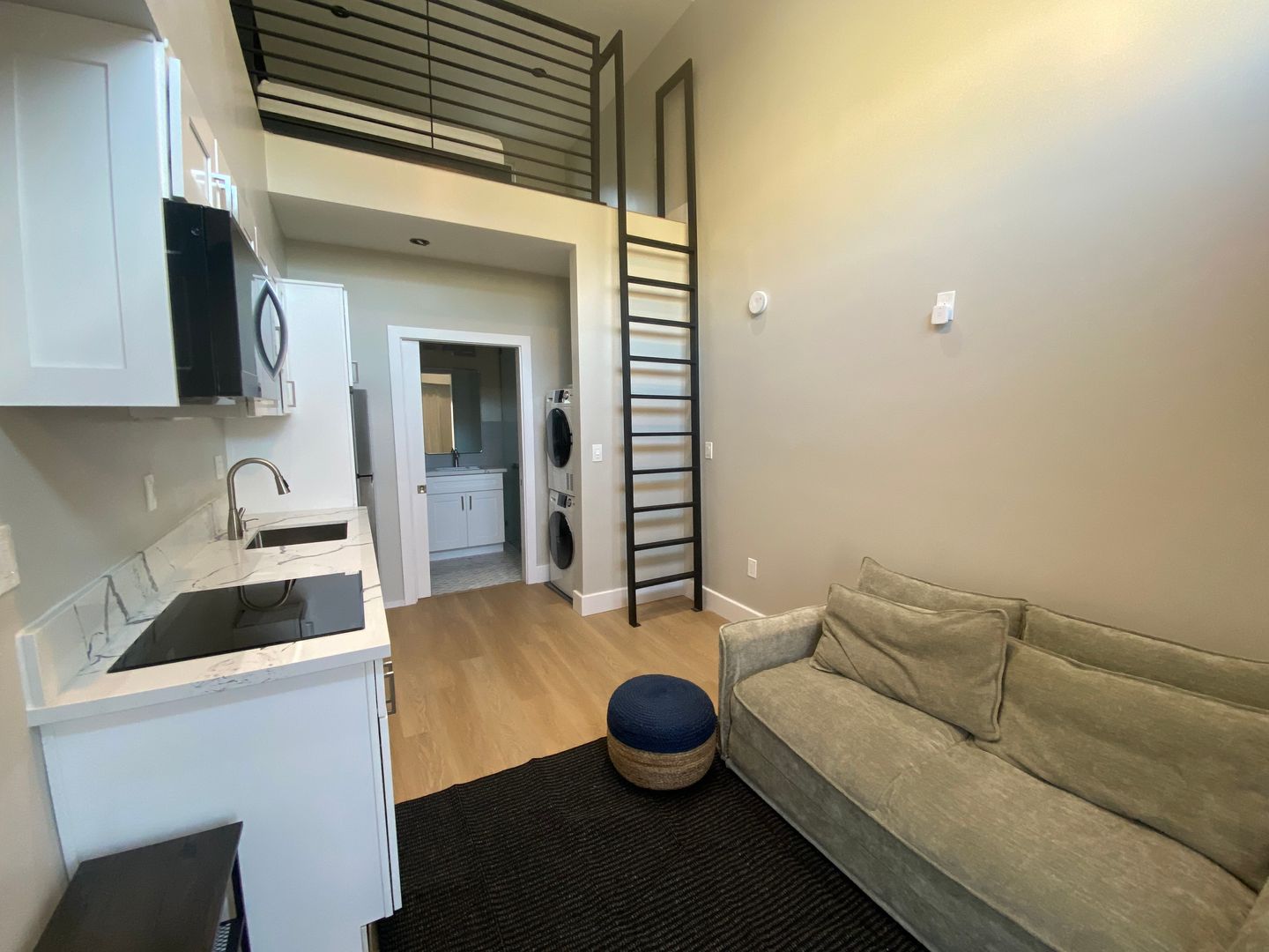 Elegant fully furnished residence that pair minimalist design with everyday convenience. The main floor features an efficient kitchen with full-height cabinetry, refrigerator, an in-unit washer/dryer, and a sleek full bath. A ladder staircase leads to a generous storage loft space overlooking the below. Pristine, stylish, and move-in ready, these boutique homes offer an inviting retreat just moments from local cafés, transit, and neighborhood amenities.
